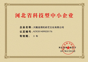 2017年7月22日,經河北省科技廳審核評定,鄭氏砂藝文化有限公司被評為《河北省科技型中小企業》。這是繼2013年后,我公司再次獲此殊榮。