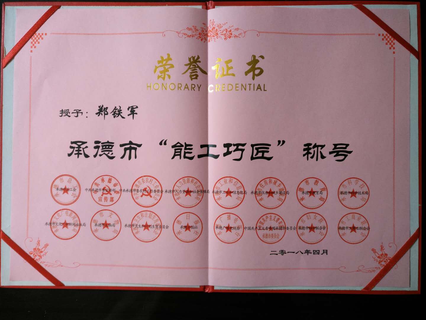 2018年4月,經承德市總工會、承德市委宣傳部、市文化廣電新聞出版局、市人力資源和社會保障局等16個大單位聯合評選,授予公司總經鄭鐵軍同志《承德市“能工巧匠”稱號》,以表彰他在砂畫藝術創新發展歷程中所做出的突出貢獻。