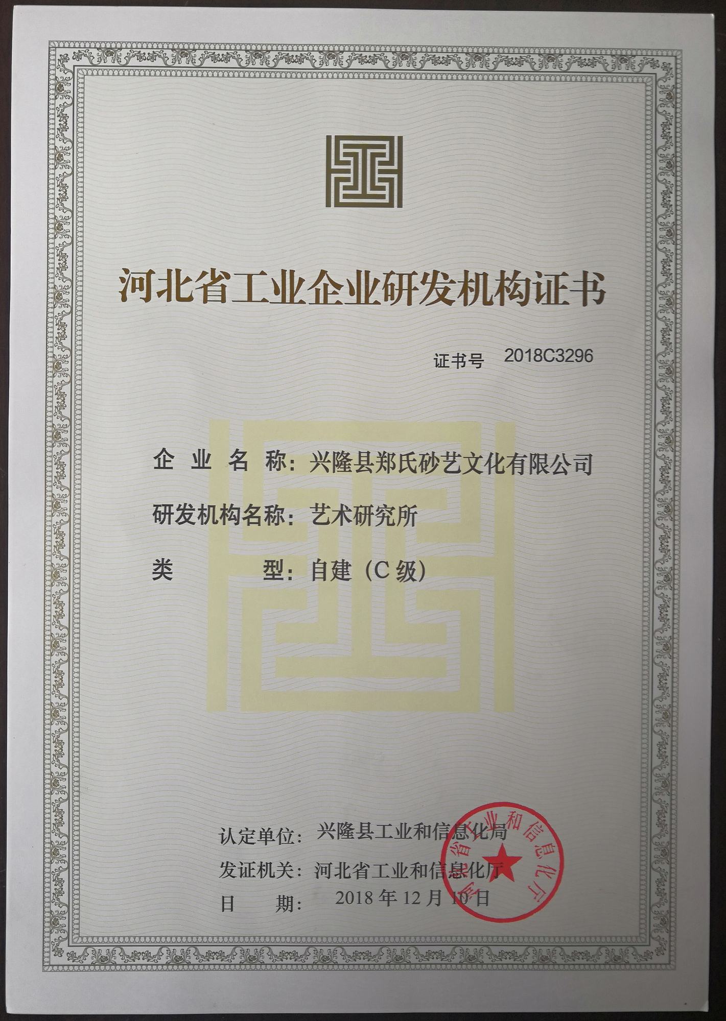 公司自建藝術研究所獲得《河北省工業企業研發機構證書》