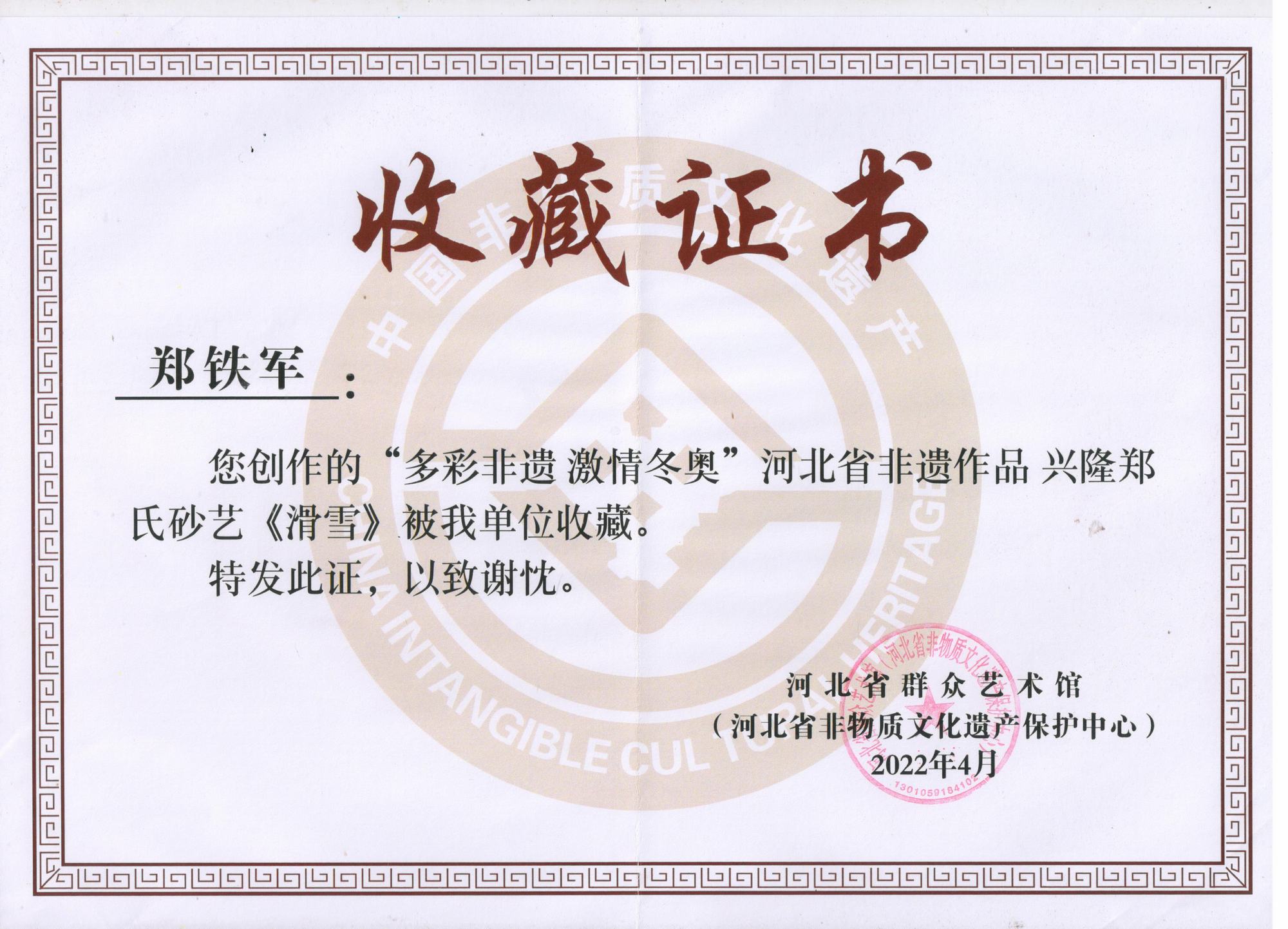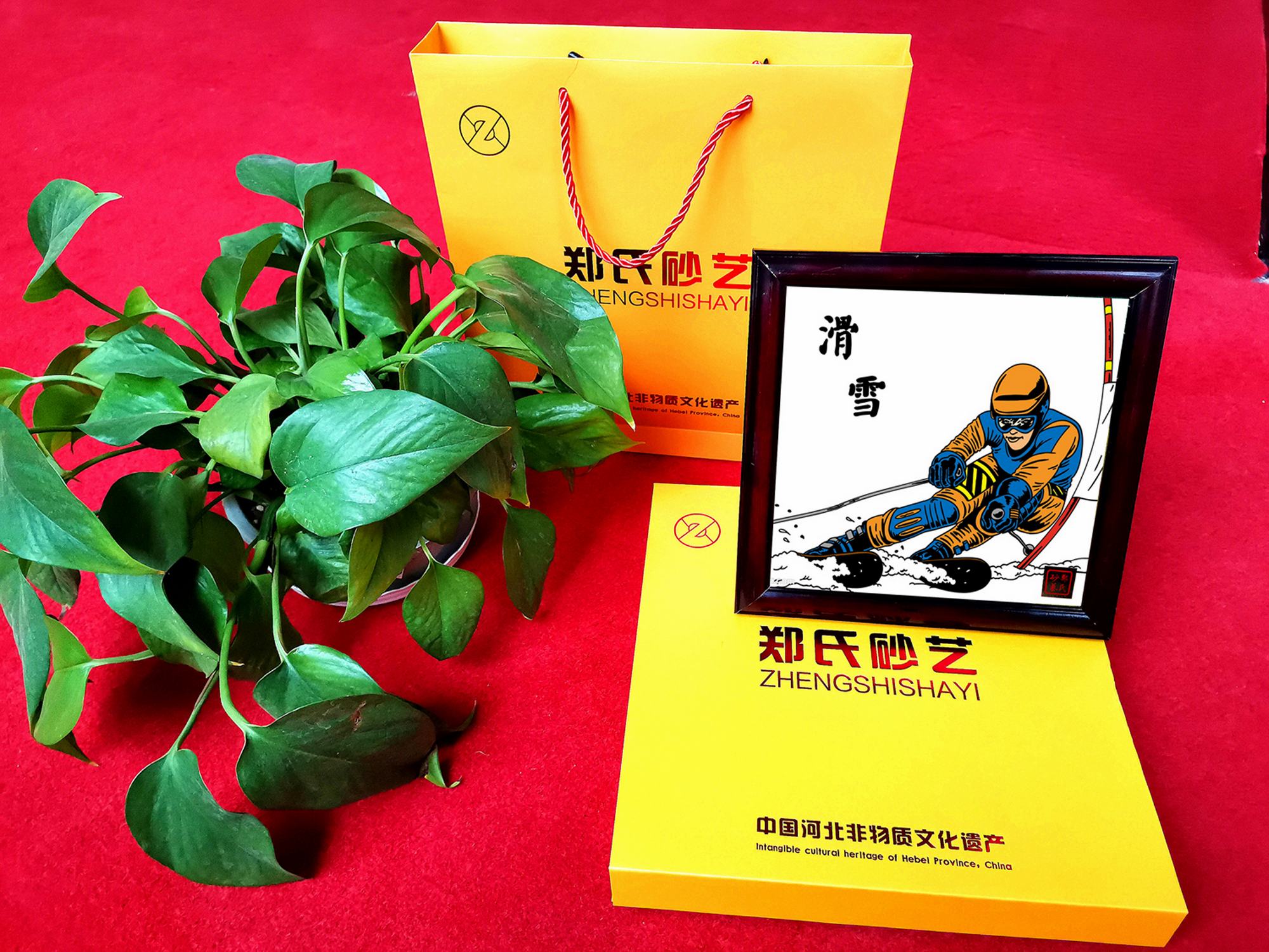 2022年北京冬奧會是我國重大歷史節點的重大標志性活動,也是河北省推動京津冀協同發展、雄安新區規劃建設、冬奧會籌辦“三件大事”之一。因此省群眾藝術館(省非遺保護中心)按照河北省文化和旅游廳的部署在全省開展了“多彩非遺激情冬奧”非遺主題作品征集活動,本次作品以冬奧文化、冰雪文化、春節文化為題材,通過藝術展現冰雪運動,應邀鄭氏砂藝執行董事國際工藝美術大師鄭鐵軍創作的砂畫作品《滑雪》、《競技》兩幅作品參展,并被省群眾藝術館和省非物質文化遺產保護中心永久收藏。