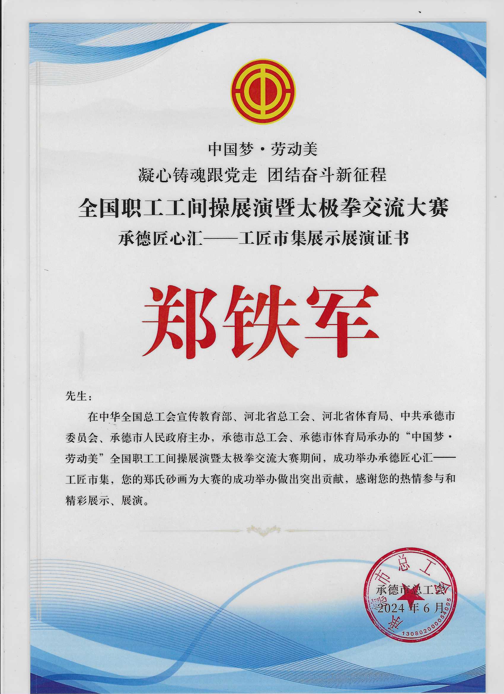 2024年6月4日,由全國總工會宣傳教育部、河北省總工會、河北省體育局、承德市委市政府聯合舉辦的“中國夢·勞動美——凝心鑄魂跟黨走 團結奮斗新征程”全國職工工間操展演暨太極拳交流大賽活動在承德市奧體中心開幕。本次大賽為期三天,包括工間操展演大賽、太極拳交流大賽、健步走大賽,共有來自各省、自治區(qū)、直轄市,各全國產業(yè)工會、中央和國家機關工會聯合會的36支參賽隊600余名職工參賽。