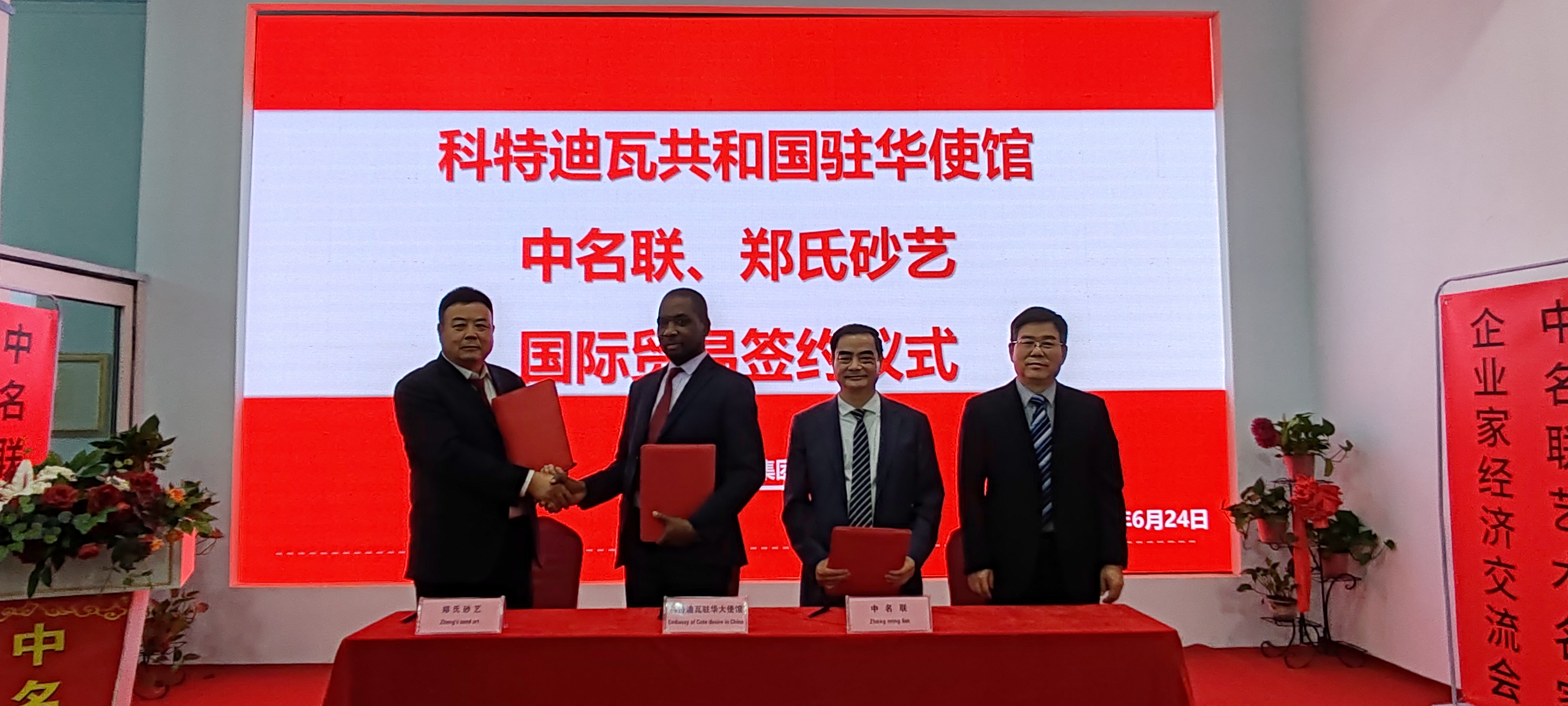 簽約儀式后,科特迪瓦共和國駐華大使、鄭氏砂藝董事長鄭鐵軍和中名聯董事長戴本領先后致辭,科特迪瓦共和國駐華大使表示很高興能和鄭氏砂藝、中名聯簽署三方貿易合作協議,他說:“中國與科特迪瓦自1983年3月建交以來,雙邊友好關系穩定發展,政治互信不斷加深,經貿互利合作不斷擴大,同時,中國政府還向科特迪瓦提供了力所能及的發展援助,中國企業家對科特迪瓦的投資,對促進科特迪瓦經濟社會發展發揮了積極作用。希望通過合作不斷提高兩國文化交流,不斷增強中非人民的友誼。”