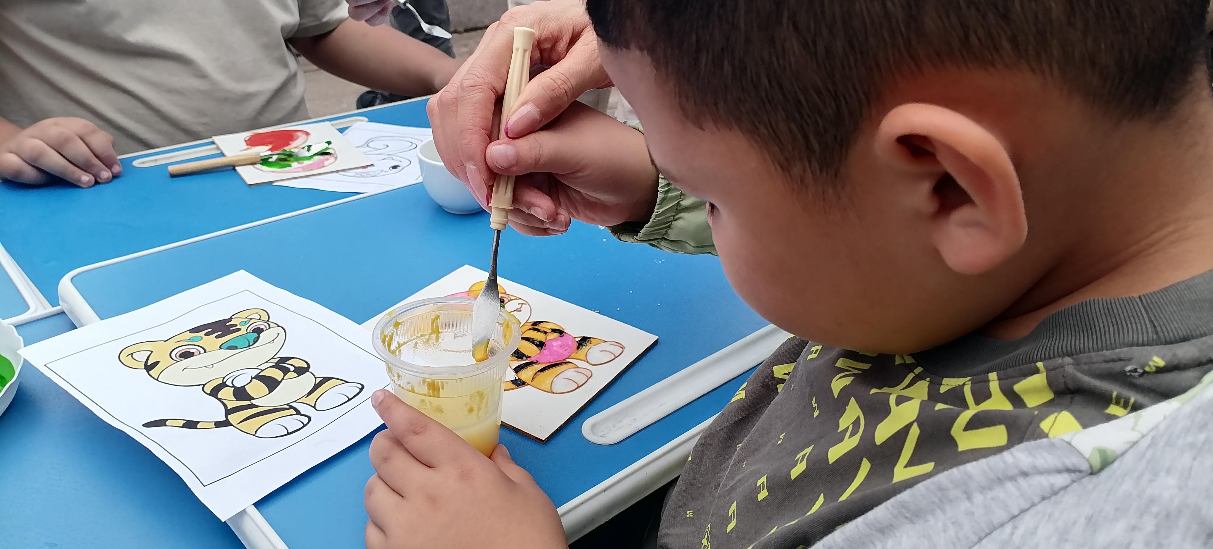 活動現(xiàn)場,鄭氏砂藝的“天然彩砂+金銀絲”工藝成為孩子們的“興趣焦點”。作為興隆縣的省級非遺項目,鄭氏砂藝以天然礦物彩砂為原料,采用金絲銀線勾勒圖案輪廓,再填充彩砂的傳統(tǒng)手法,既保留了鄉(xiāng)土文化特色,又蘊含著非遺技藝的巧思。為讓孩子們輕松參與,技師們特意提前制作了粘好金絲的半成品——一幅幅待填充的砂畫作品,將“最精彩的創(chuàng)作環(huán)節(jié)”留給孩子。“我要給小虎的臉涂綠色!”“我喜歡藍色的眼睛!”孩子們圍坐桌前,手持作畫小鏟,認真地將色彩砂石填入金絲框架,同時互相交流“配色秘訣”,現(xiàn)場充滿了童真與熱鬧。