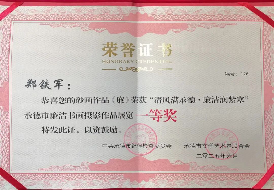 近日,“清風滿承德·廉潔潤紫塞”承德市廉潔書畫攝影作品展覽評選結果揭曉,砂藝創作者鄭鐵軍的作品《廉》榮獲一等獎。該獎項由中共承德市紀律檢查委員會、承德市文學藝術界聯合會聯合頒發。